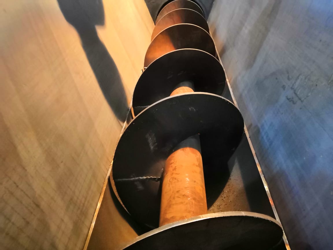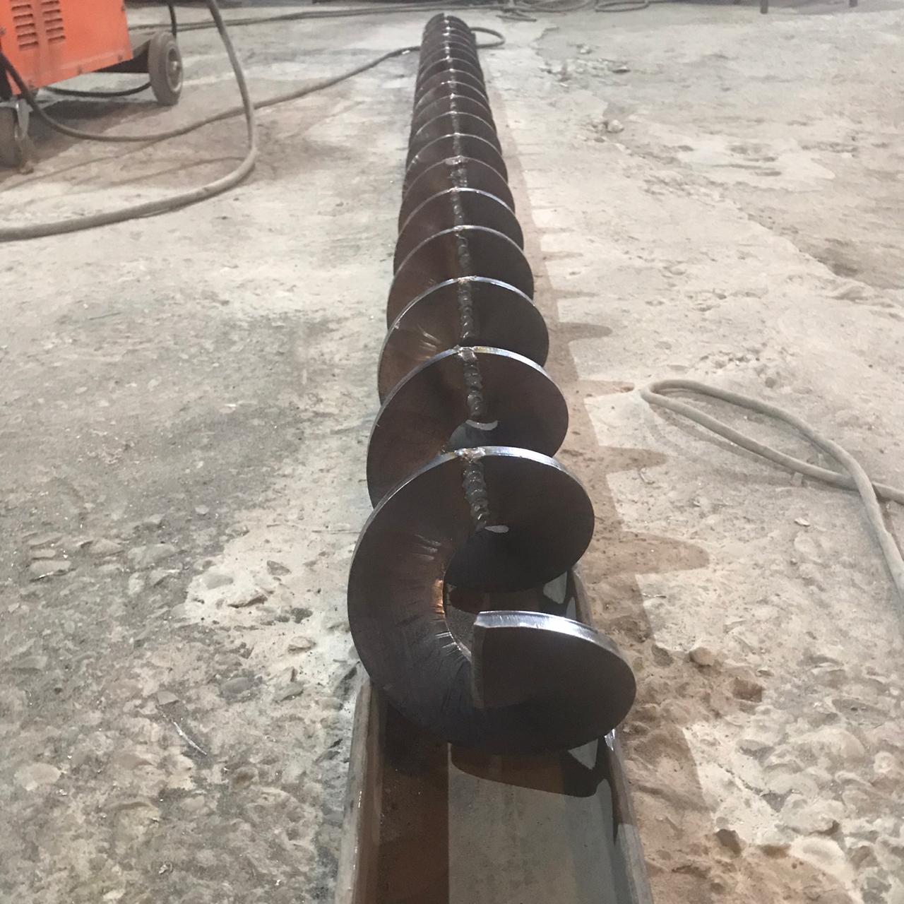 Долгое время мы использовали цельновитую спираль (витая полоса). В процессе эксплуатации наши заказчики сталкивались с такой проблемой, как быстрый износ витков шнека со стороны внешнего диаметра. Это связано с технологией изготовления таких спиралей. Так при их навивке полоса получается с уменьшением толщины от внутреннего диаметра к наружному. Из-за этого вставал вопрос к надежности и прочности самого несущего элемента – шнека.